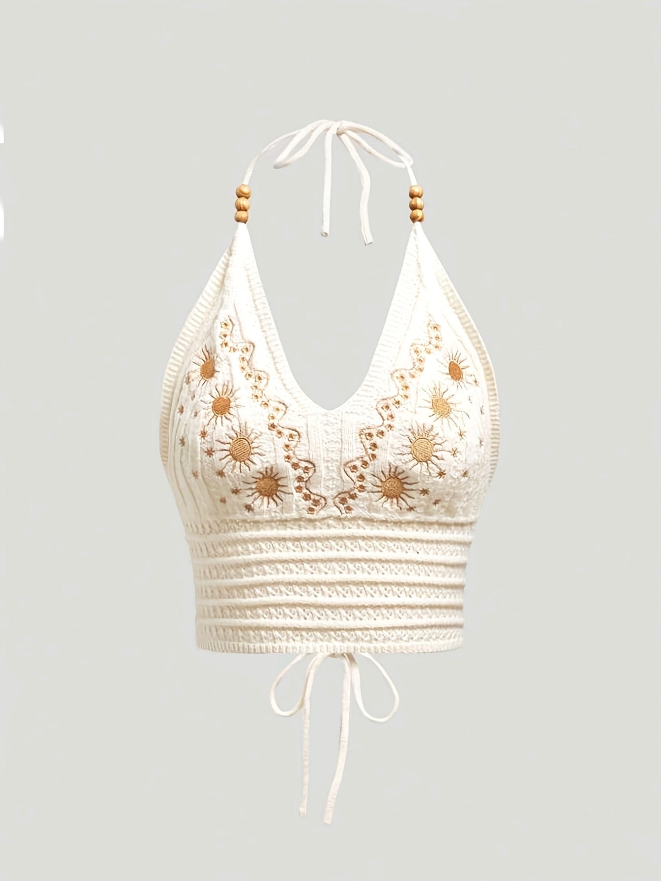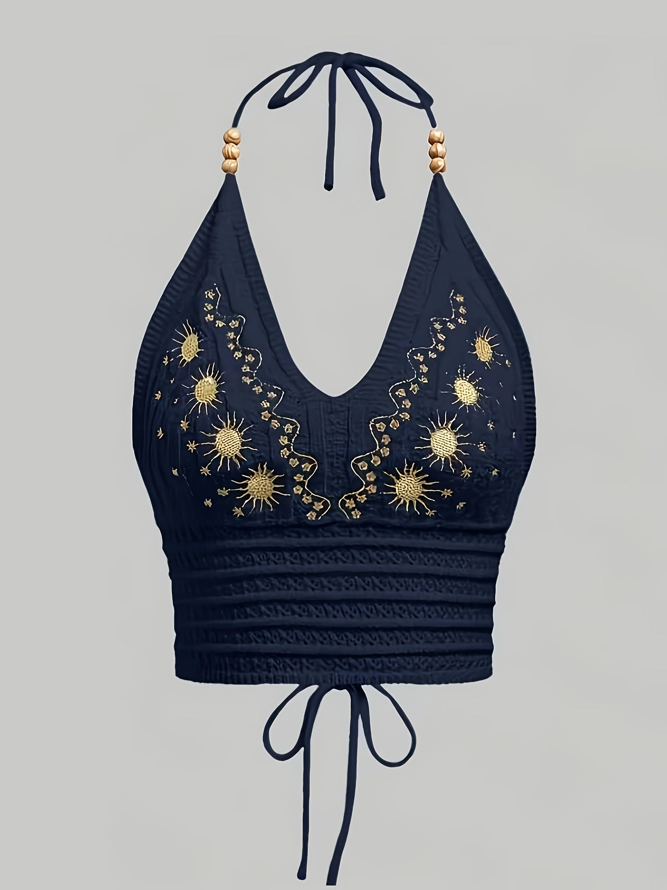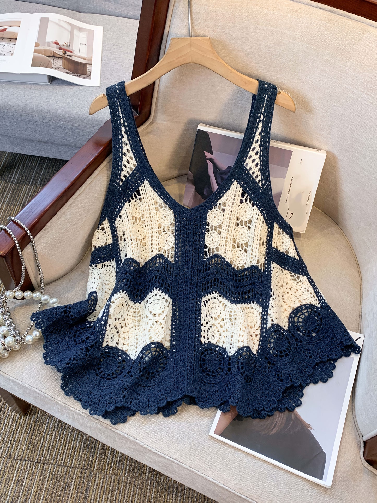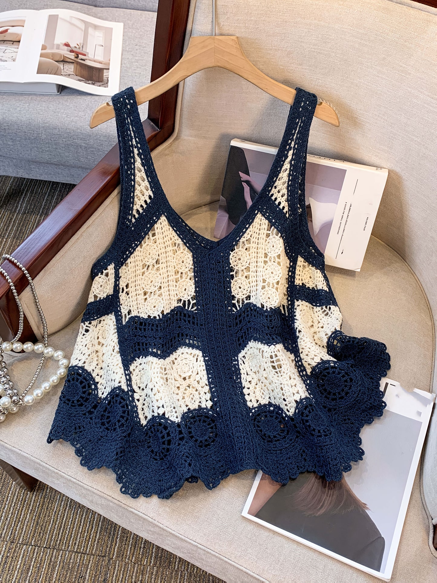 Add Women's Bohemian Crochet Sleeveless Tank Top - Navy & Contrast Lace Cut-Out Design, Semi-Sheer Summer Casual Shirt for Beach Outings & Layering to the cart