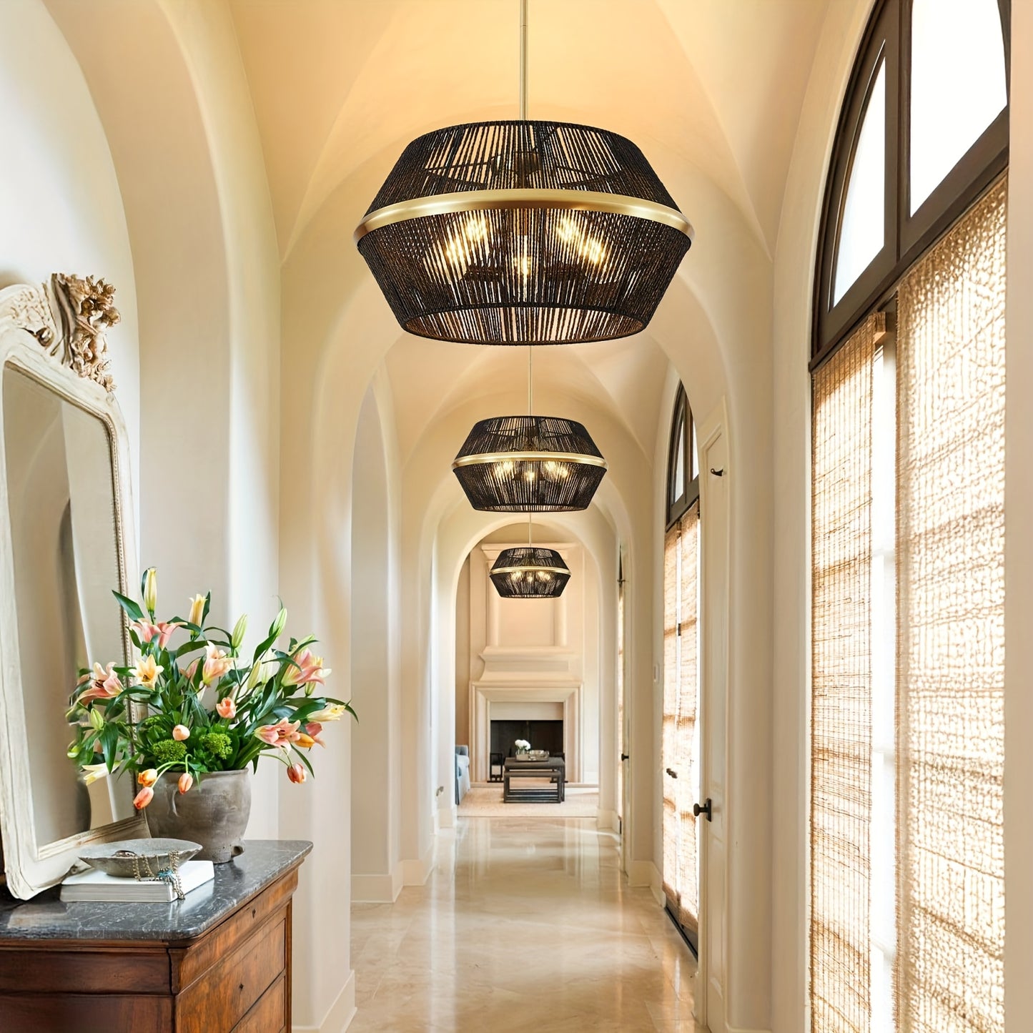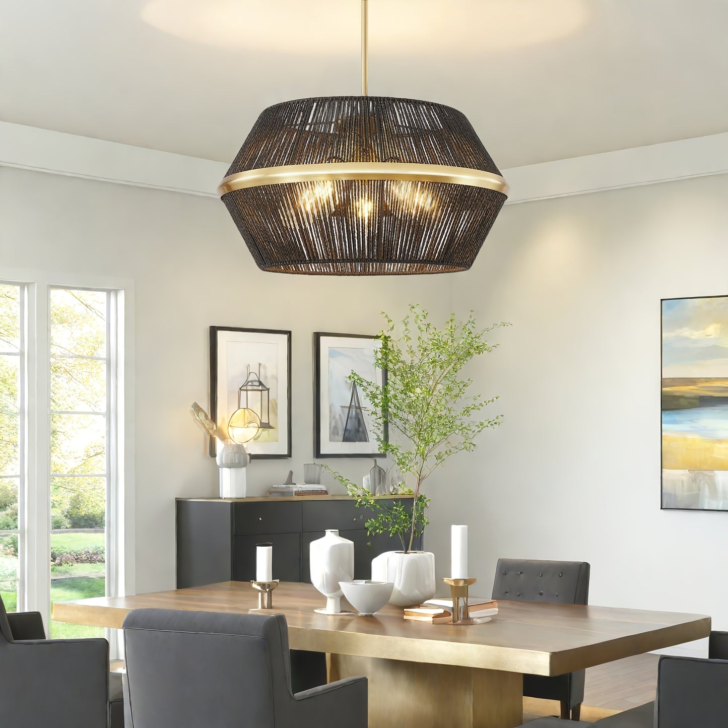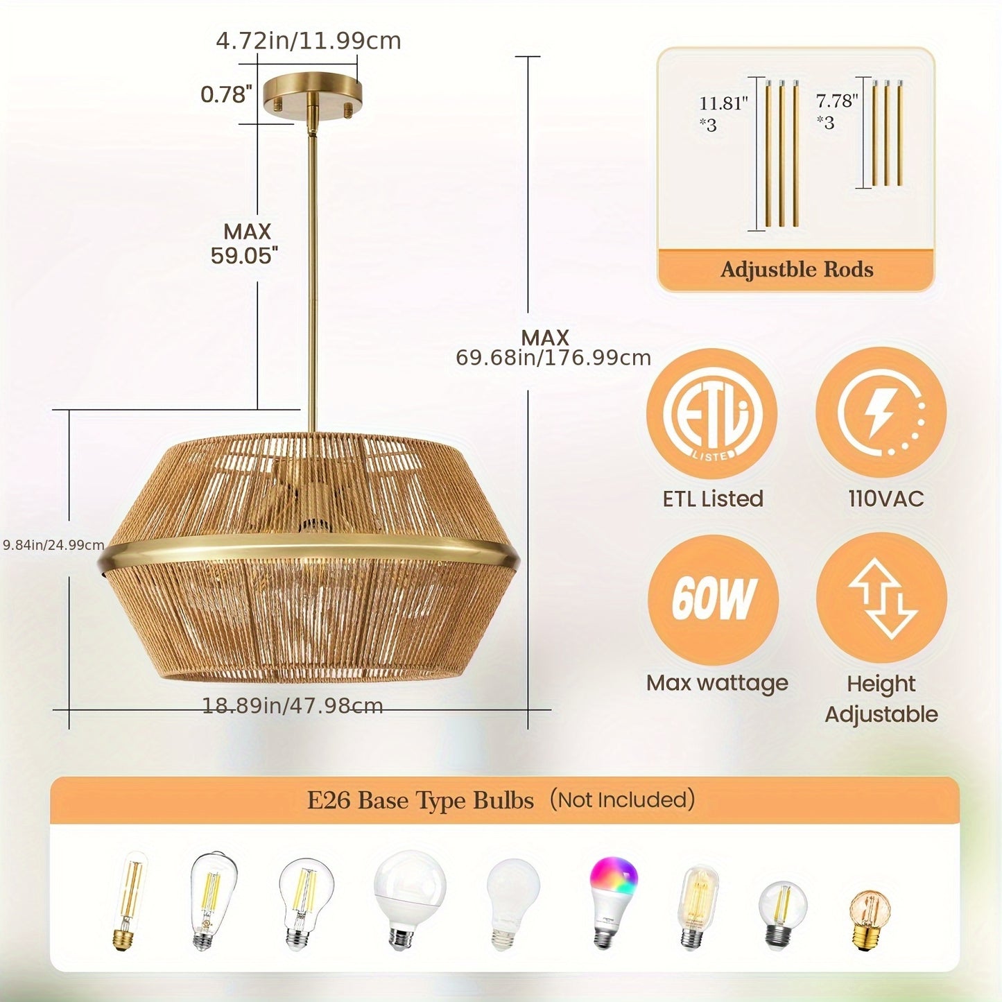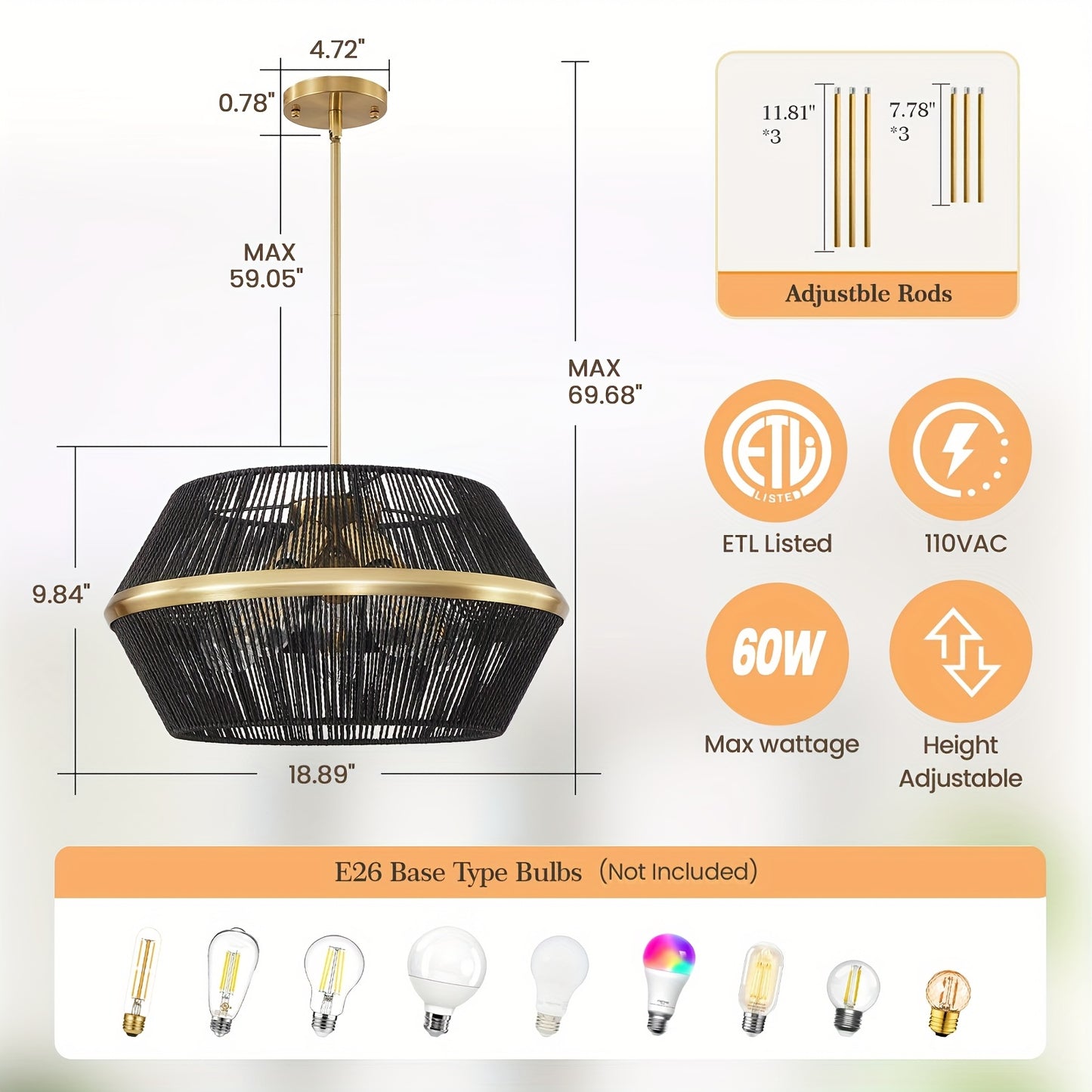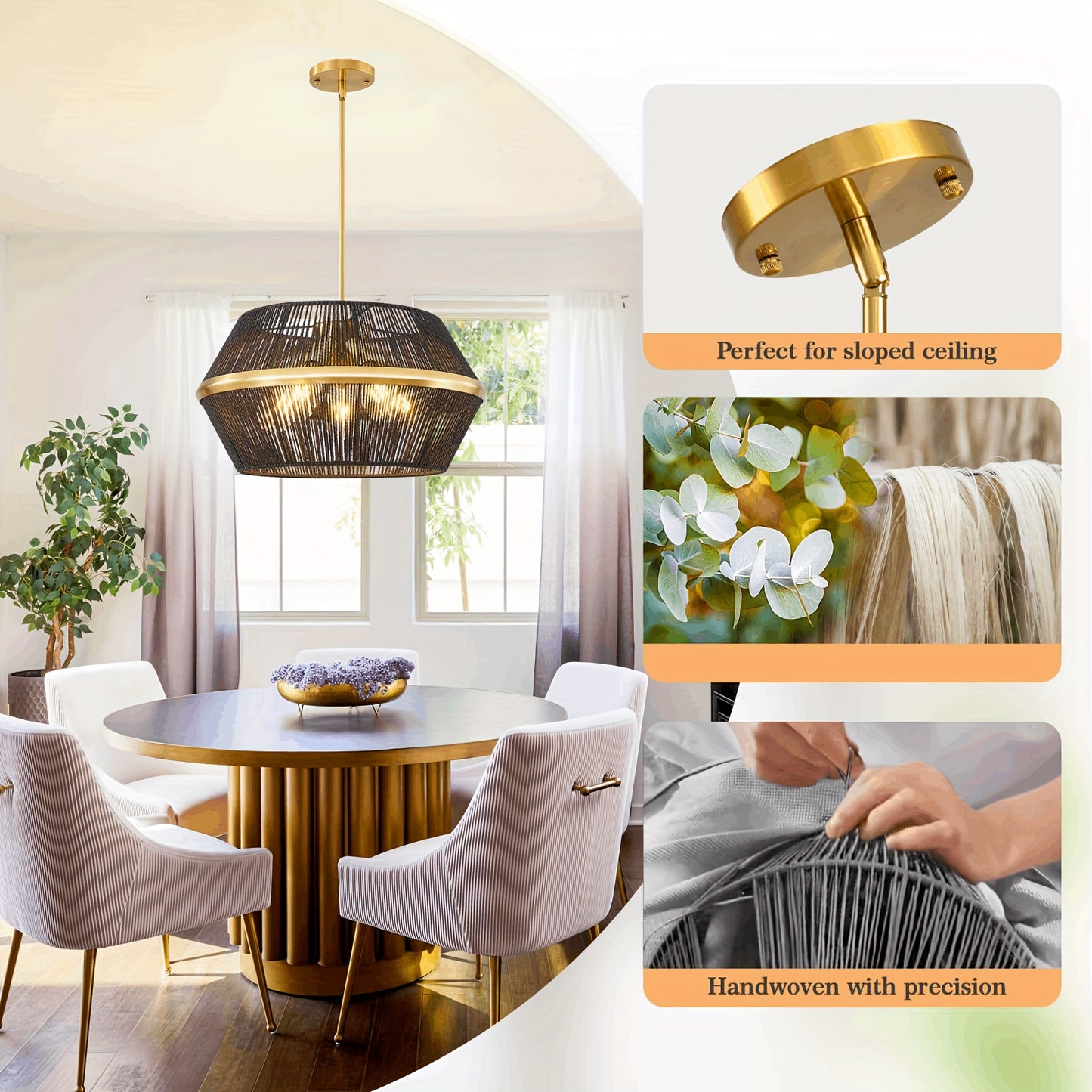 19" Adjustable Height 5-Light Black Rattan Farmhouse Chandelier - Hand-Woven Boho Pendant Light Fixture for High Ceilings, Rustic Dining Room & Kitchen, Easy Install with Hardware Included