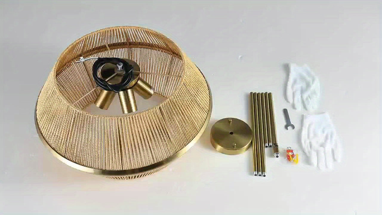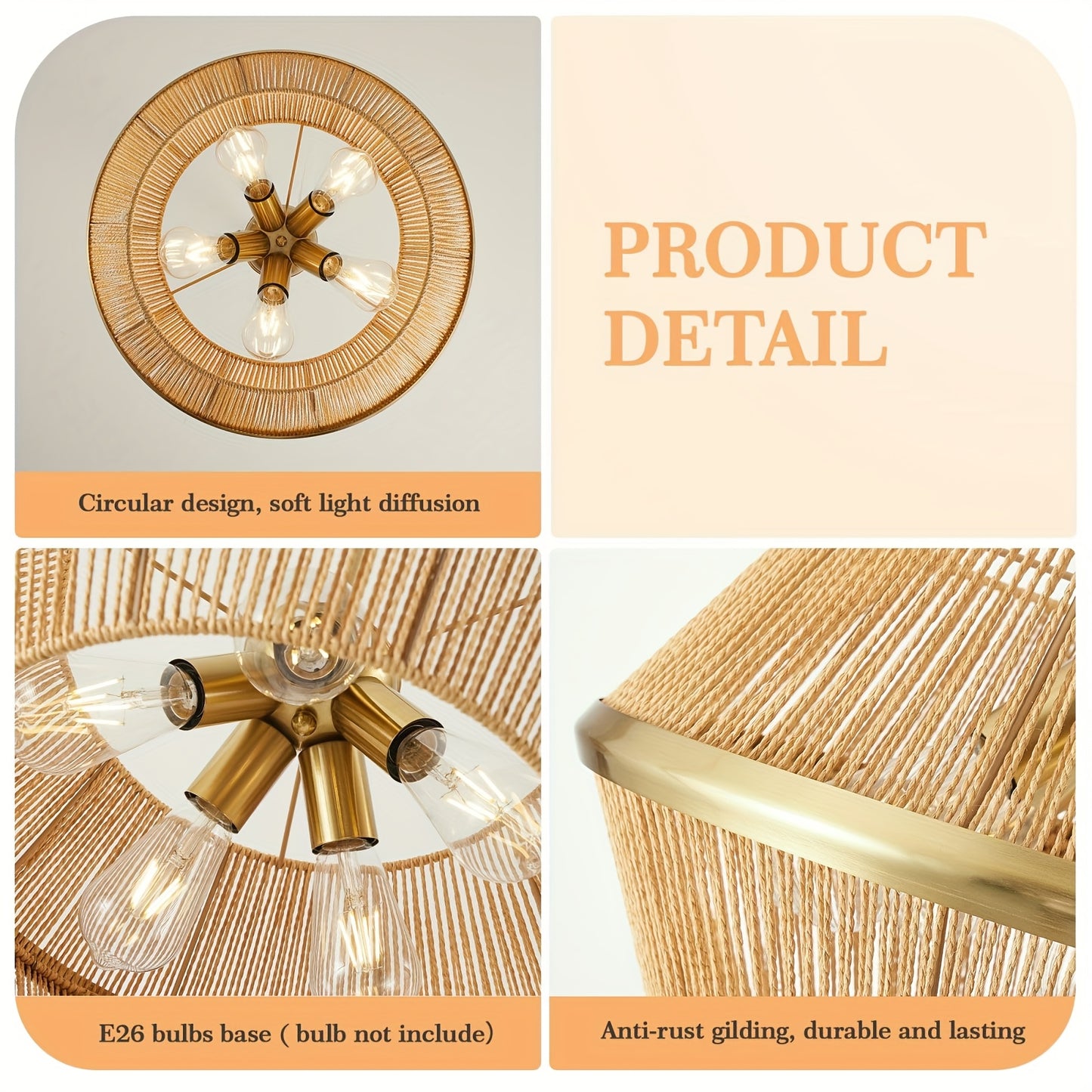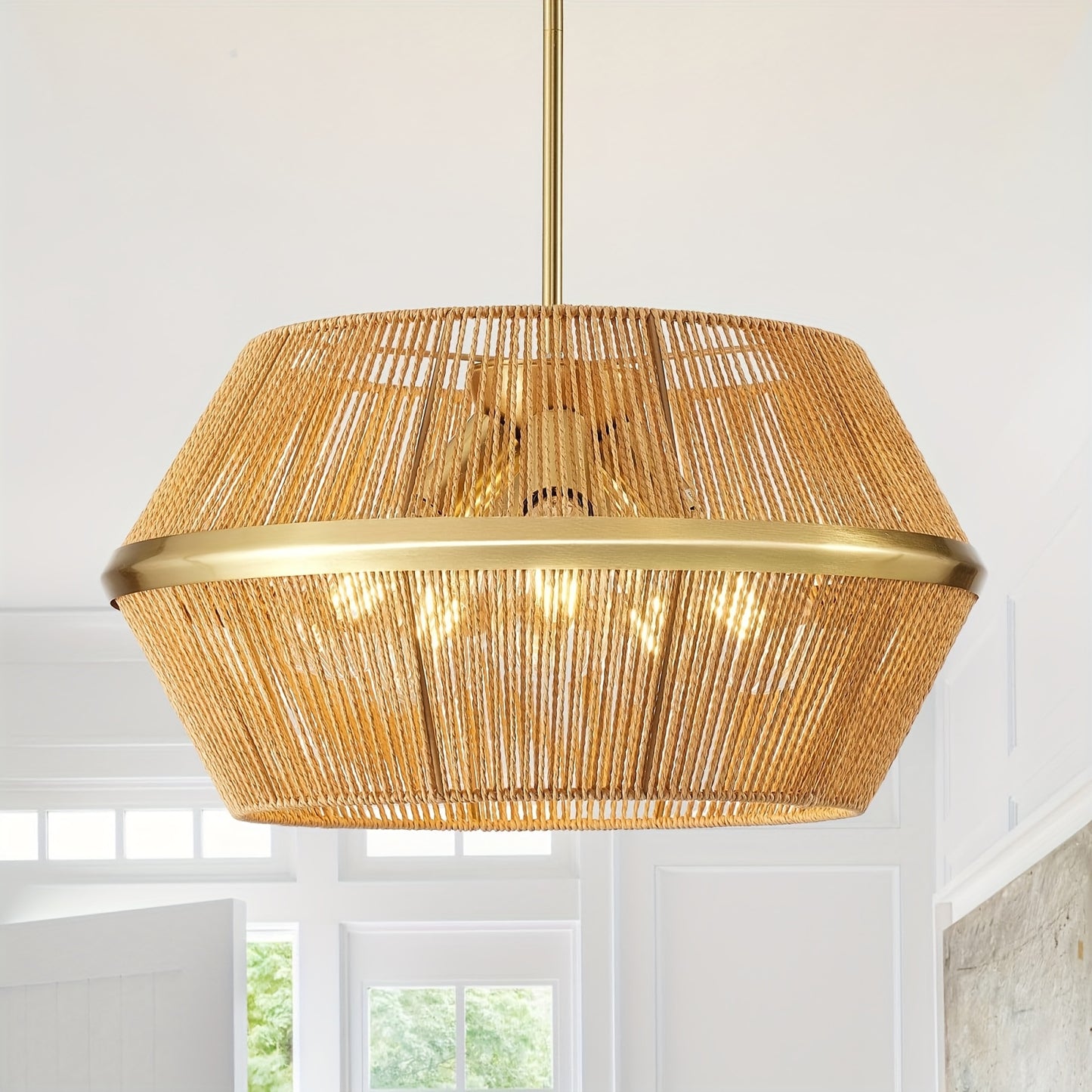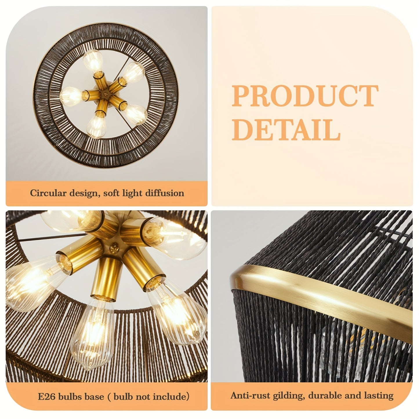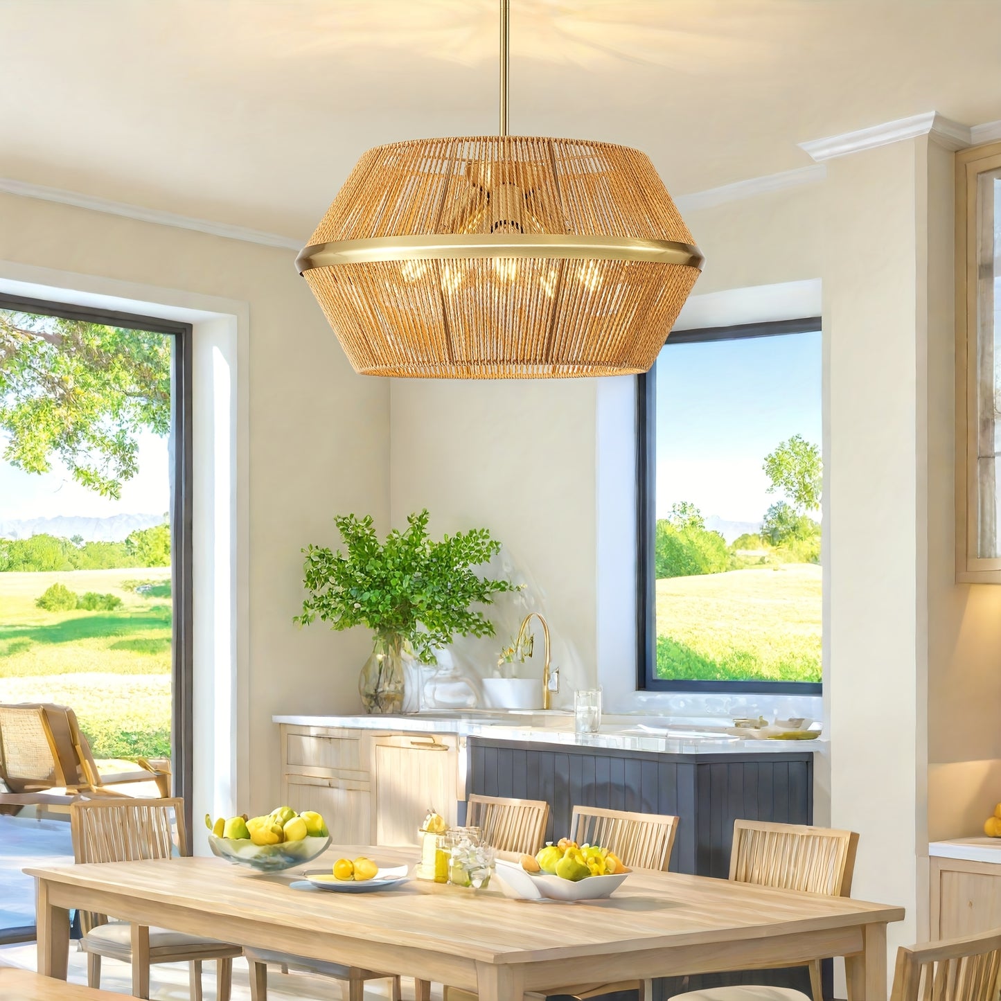 19" Adjustable Height 5-Light Black Rattan Farmhouse Chandelier - Hand-Woven Boho Pendant Light Fixture for High Ceilings, Rustic Dining Room & Kitchen, Easy Install with Hardware Included