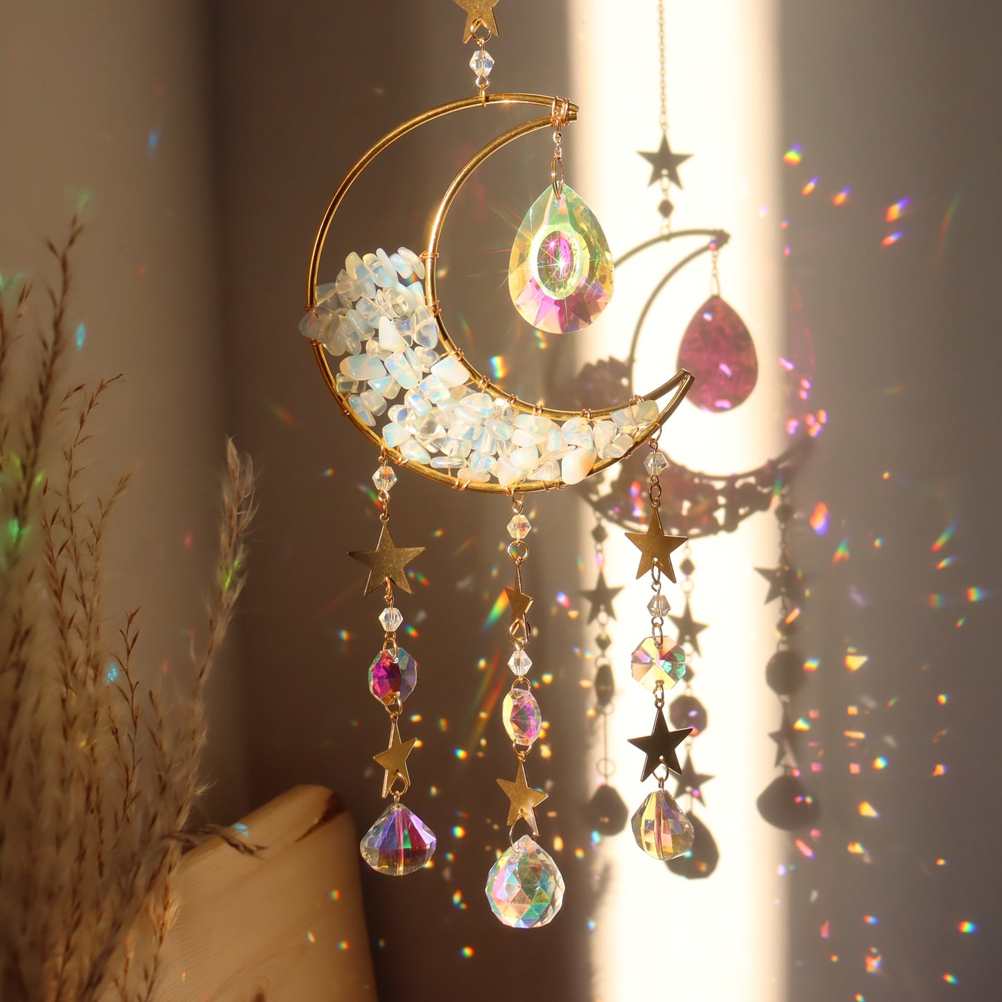 3pcs Rainbow Amethyst Moon Crystal Prism Sun Catchers with Golden Crescent Moons, Blue & Pink Gemstones, and Star Accents for Home and Garden Decor