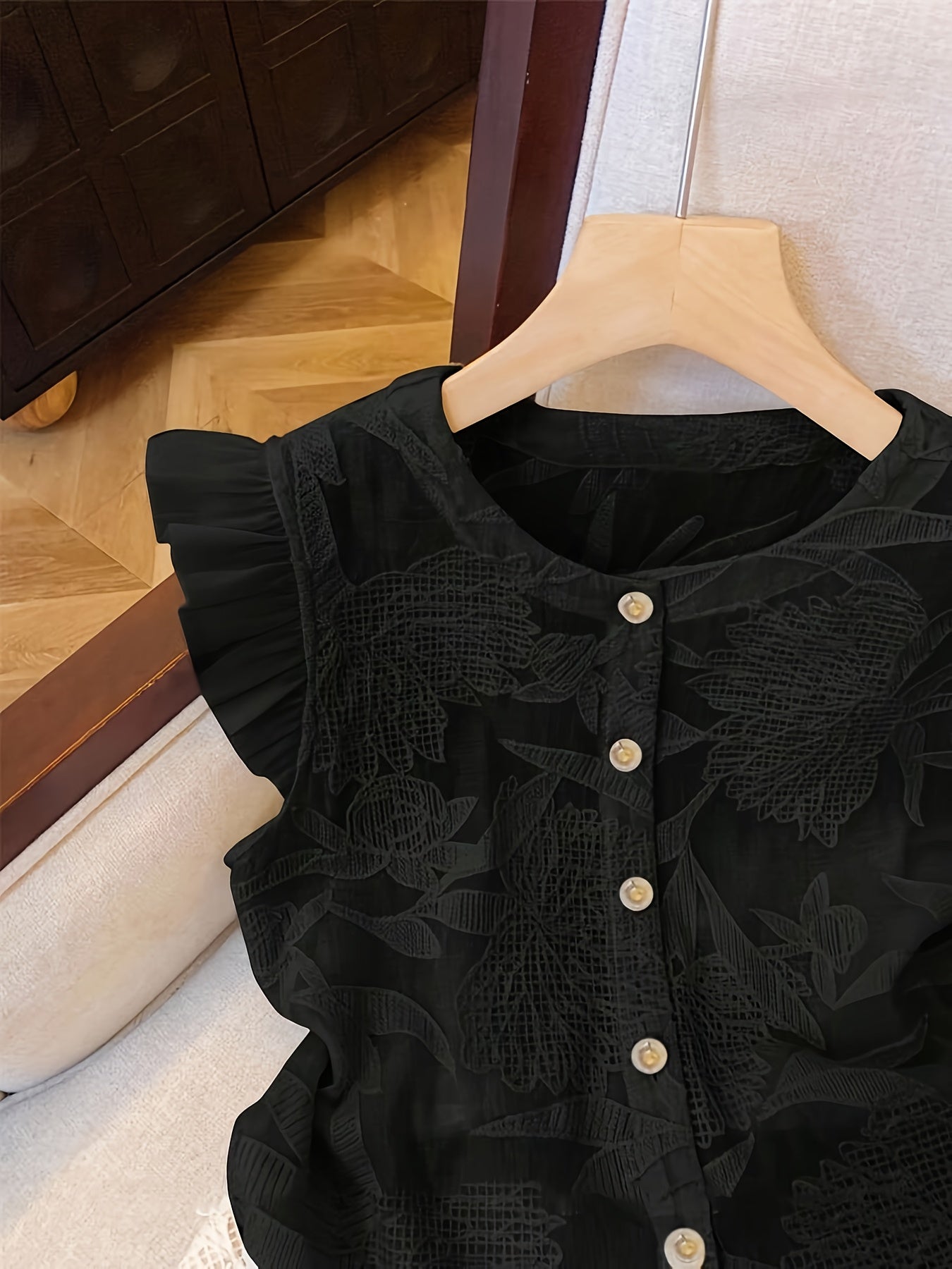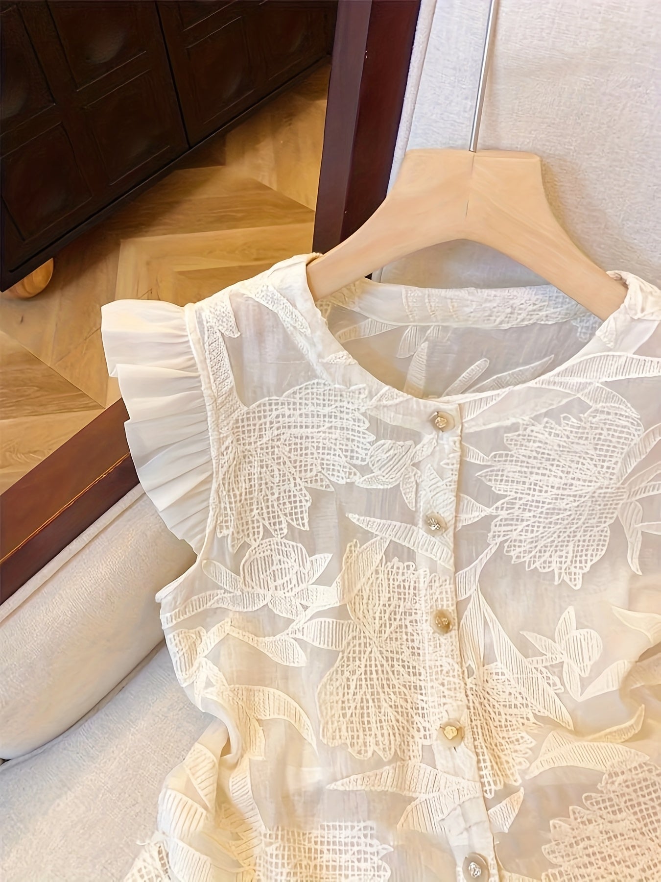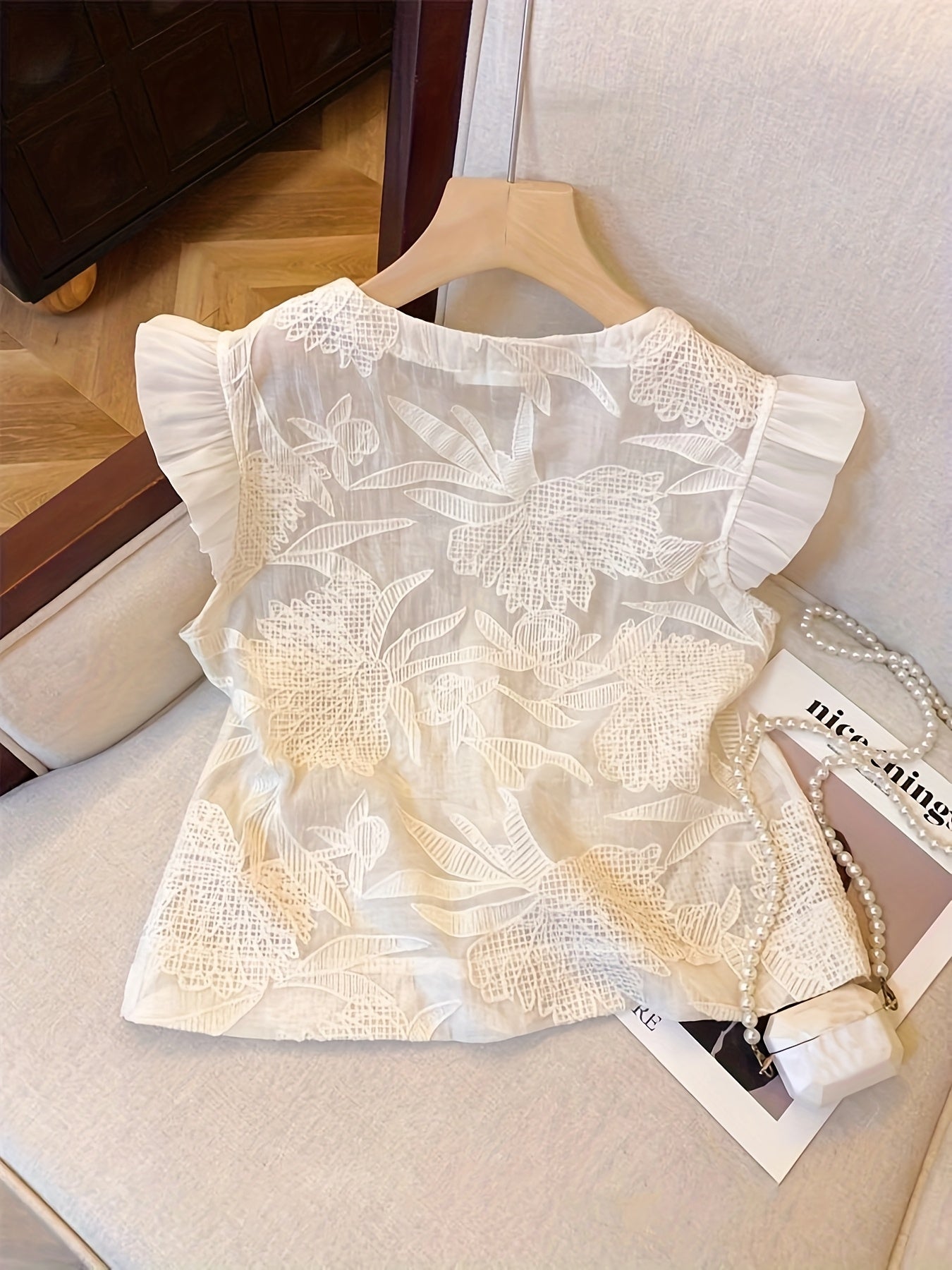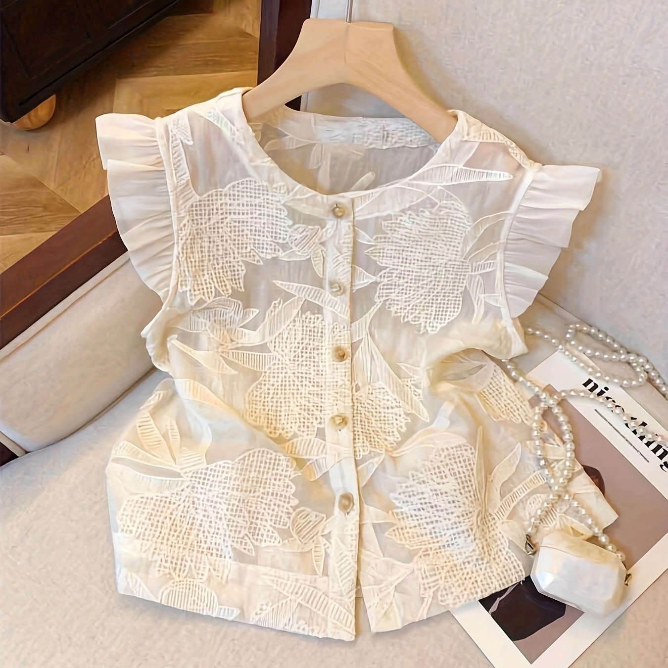 [French-Inspired Lace Blouse] Chic White French-Inspired Lace Blouse with Puff Sleeves & Button Front - Perfect for Spring/Summer/Fall, Casual to Formal Wear